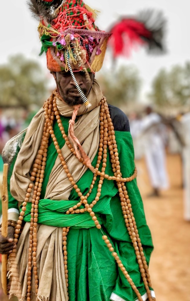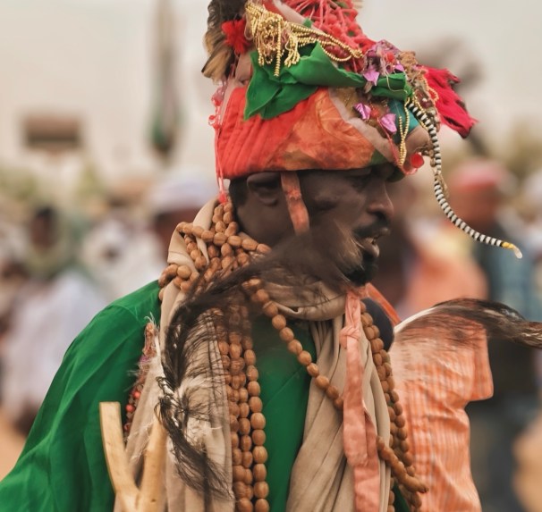 “The way worshippers dress is also a sign of their standing within the Sufi order. ‘This jalabiya and the misbaha [prayer beads] that I wear define my rank in the dhikr and the tariqa,’ one woman interviewed in The Guardian’s The psychedelic world of Sudan’s Sufis – in pictures explains.