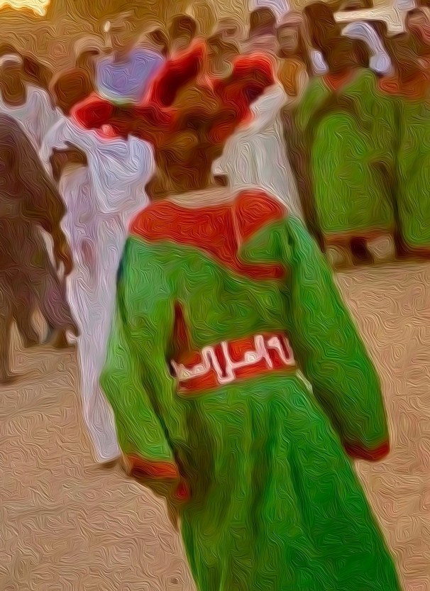 Green is often held to have religious significance in Islam as it is the colour associated with paradise. “A woman in the crowd explains why green is such a significant colour for the Sufi order. I’m wearing a beautiful green jalabiya. It was a gift from my sheikh, and looks like the typical great Sufi dresses. It symbolizes the simplicity and the calm of Sufism, and its calm and beauty.’ Most cloaks and garments, she says, are bestowed to the dervishes by the order’s sheikh during formal initiation ceremonies.” (The Guardian, as above)