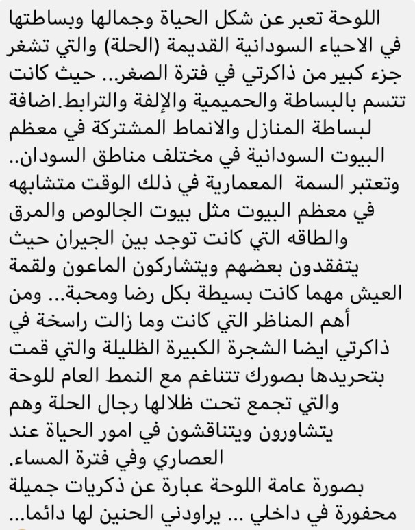 Reem graduated in Art Education and Textile Design from the Sudan University of Science and Technology in 1996. My thanks to https://www.facebook.com/mojogallerysd/ for the commentary on this piece.