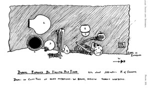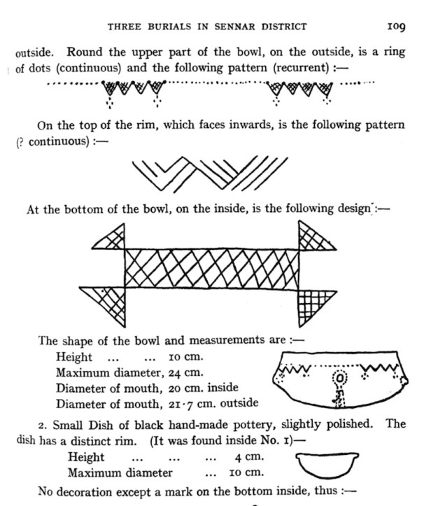 Below, the carefully placed pots in an ancient tomb revealed by flooding in the Sennar region under colonial rule. (Source: Three Burials in Sennar District by A.J.Arkell, Sudan Notes and Records,Volume 17, No 1, 1934. The meaning of the positioning of the pots – some upright, some inverted in ancient graves – is still a matter of debate.