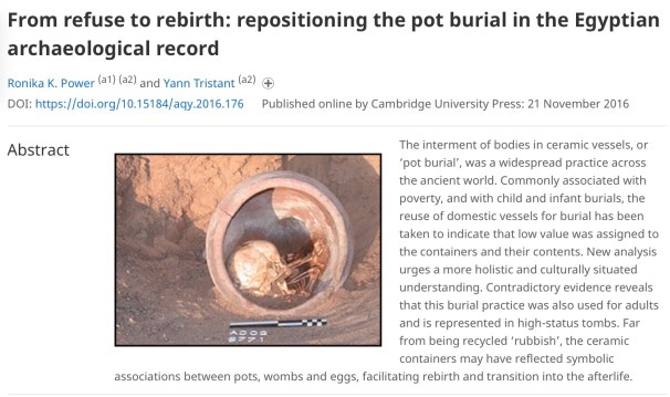 And Dr Azhari goes on to suggest “that the enclosure of an infant – one who had not yet grown to the age of initiation into adolescence – in the vase could be symbolic of the enclosure of the individual in the womb.” He recalls that pot burials for stillborn infants are still used by some communities in northern Sudan. He explains that the Sudanese view the pot “as a metaphor for the ideal womb, protective and watertight” – and one which would never miscarry. In Megauda village near Old Dongola, he was informed, new-born dead infants are placed within qadus and buried near the family home.