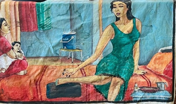 Above left, a sketch based on a photo of a young woman in Northern Province, early 1980s. Seated on the edge of her angareeb bed, she waits for her hennaed soles to dry and set in the sun. Above right, a photo showing how the Lake Erie Sudanese community decorated a building with traditional Sudanese henna motifs, (link no longer available.) See the fascinating connection between Nubian house decoration and women’s henna designs in Inscriptions on Rosewater. Above, a henna farmer from El Damer, holding sprigs of young henna plant. See the video clip at the end of this blogpost for more on the prized El Damer henna. An English transcript available on request.