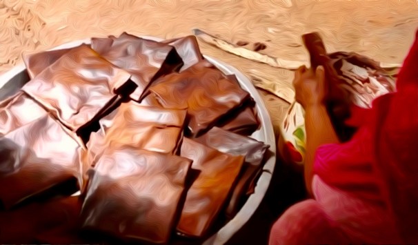 Above, pouches of freshly made hilu murr gleam like burnished leather on a kitchen tray. Title sketch, spreading wafer-thin layers of hilu murr batter on a hot griddle. Hilu murr flakes, literally “bitter-sweet/ sweet and sour”, are dissolved in water as a refreshing fast-breaking drink during the holy month of Ramadan. Its peppery, spice-laden tanginess envelopes much needed and easily digestible sugars and other nutrients.