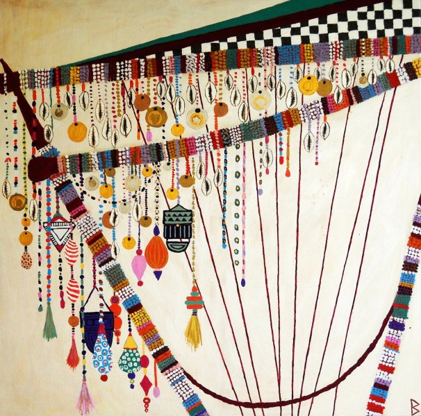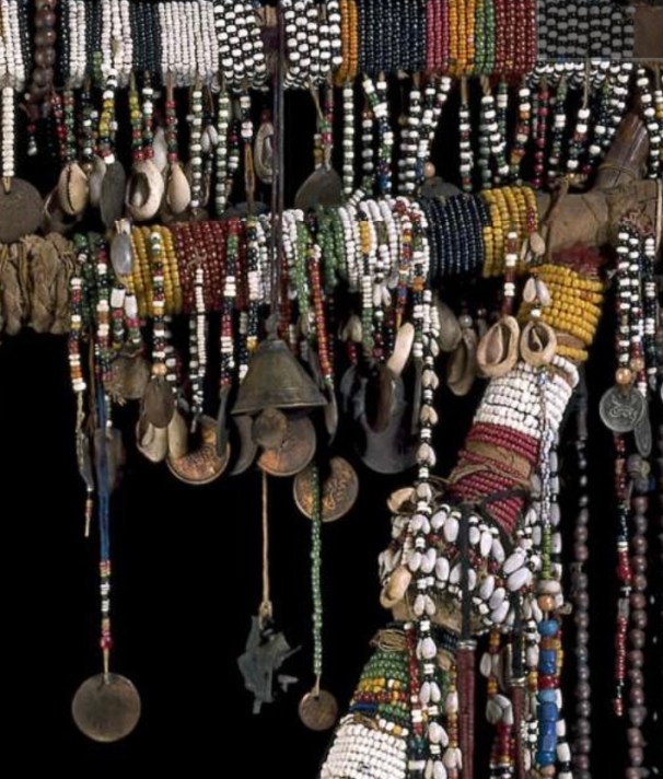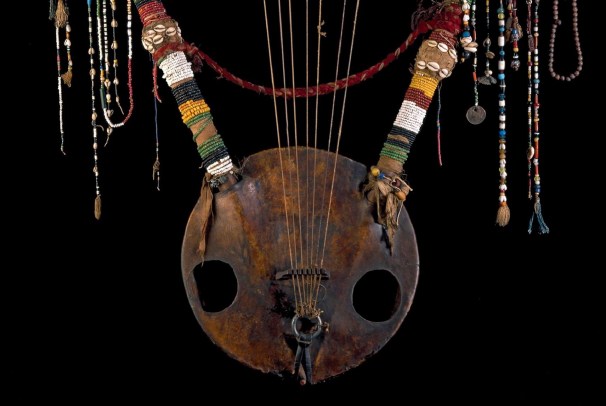Learn more about the rich symbolism of the beads, cowries and hijab amulets that festoon the lyre in: