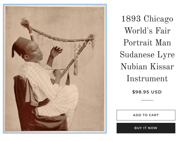 See too, the beautful 1893 Chicago World’s Fair Portrait ,”Abal Kader (Southern Sudan).” Original halftone print portrait of a man from the Sudan, playing a Sudanese lyre or Nubian kissar (periodpaper.com)