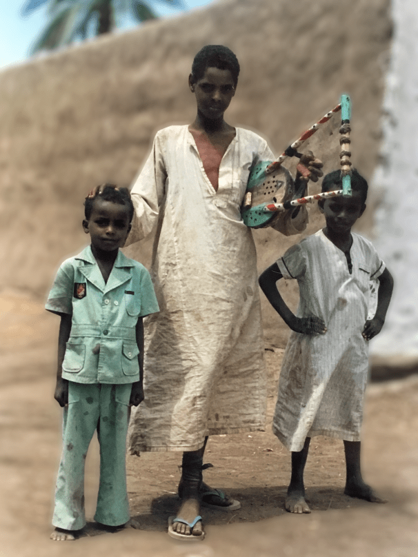 Below, village children north of Dongola with their lyre in the mid-1980s. Lyres, lovingly crafted, can be found in many Northern Sudanese homes, and “herdsmen, farmers and workers in isolated areas find great joy in playing the tanbura for recreation, to drive away boredom”, and the pangs of homesickness and lost and exiled loves.