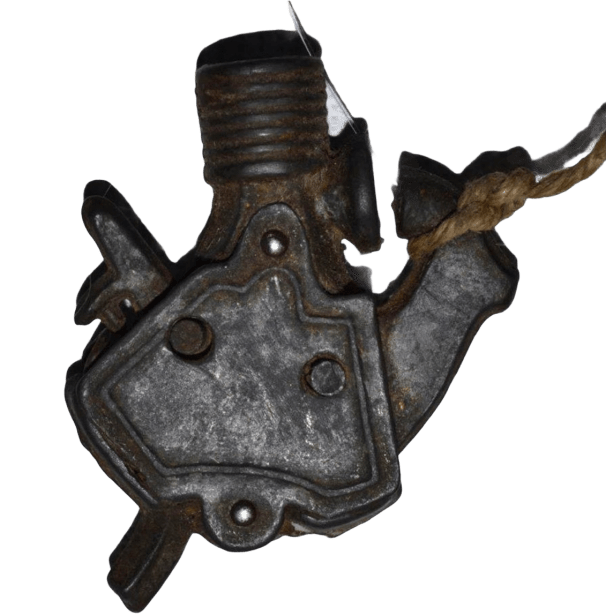 Below, the small, unidentified device, possibly the firing mechanism of a small gun or part of steam locomotive brake valve, hanging from the lyre.