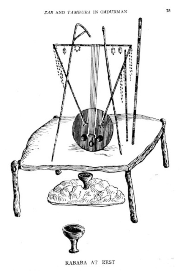 Read more about the central role of the tambor or rababa in Zar and Tambura in Omdurman, S. Zenkovsky, Sudan Notes and Records, Volume 31, 1950. Illustration below: