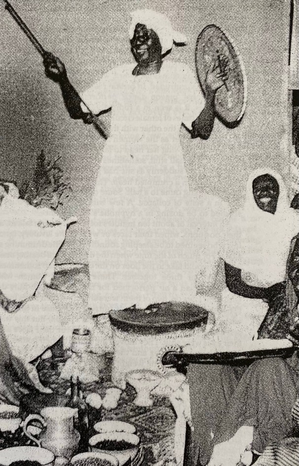 Below, a Zār sheikha (leader) dressed as a man. Her shield is a food cover of cane and palm, her spear an ebony stick. Plate from Women of Omdurman, p71. Colonial accounts of Zār ceremonies note that “when a shaikha died the corpse was conducted to the cemetery with seven incense burners, some in front, some behind.”(S.Zenvovsky)