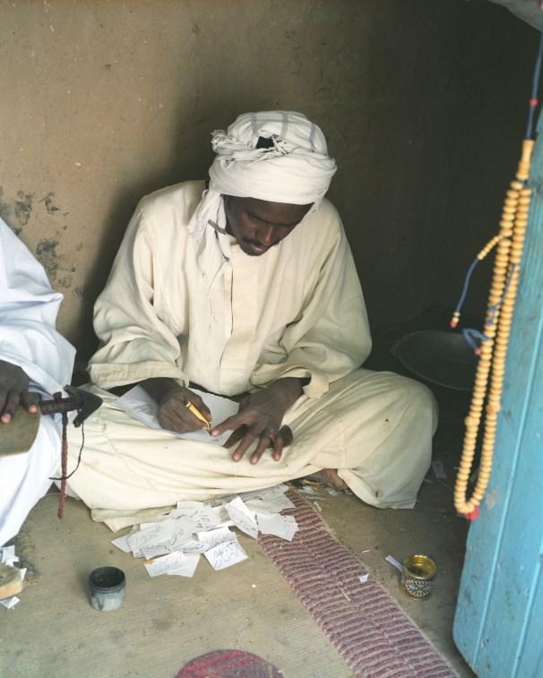 Below, a description by Dr Ahmed Al-Safi of bakhra, another form of ritual incensing for healing and warding off the evil eye; “The bakhra (pictured right) is a sheet of white paper on which the faki writes some astrological formulas, magical seals, and numerical squares, with holy verses from the Quran. The paper is then folded; a few such papers are made and given to the patient. One bakhra at a time is burnt in a mubkhar (incense burner), alone or with frankincense and ambergris. The patient bends over the incense burner, enveloped in a tobe (cloth). He then inhales the fumes. The process is usually accompanied by incantations.” See Traditional Sudanese Medicine for other types of incense used in Sudan. Right, a sketch based on a photo of bakhra from Sand in My Eyes by Enikō Nagy, p667. Below, writing verses from the Quran on paper, Alamy licenced use.