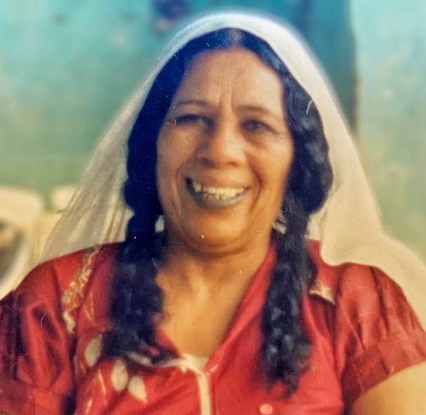 Above, and title photo, detail of an illustration by Griselda El Tayib of a married woman (Wadi Halfa, 1960) wearing the traditional and graceful jarjara robe and carrying her shallow aginde basket on her head. Her lower lip and chin are tattooed a deep indigo.