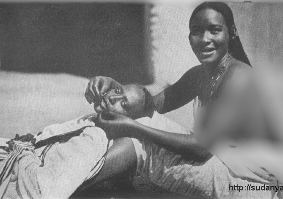 “This kind of tattooing is never seen in Omdurman on unmarried girls or spinsters. A man would not directly ask his future wife to undertake the dug-al-shaloufa, but would offer a ram, money or perhaps a toub. Then she would know this was what he was asking of her. This was not an invariable practice although it may have been at one time. Tattooing is a custom that is certainly dying out and is seldom used by the young brides of Omdurman today. I knew only one Sudanese woman personally who made arrangements to have it done and she was at least thirty years old. Tattooing was once considered becoming but the young people of Omdurman no longer thought so.” Women of the Shaiqiya told me that tattooing of the lower lip and gum was one of their customs brought to Omdurman when some of them settled there:”