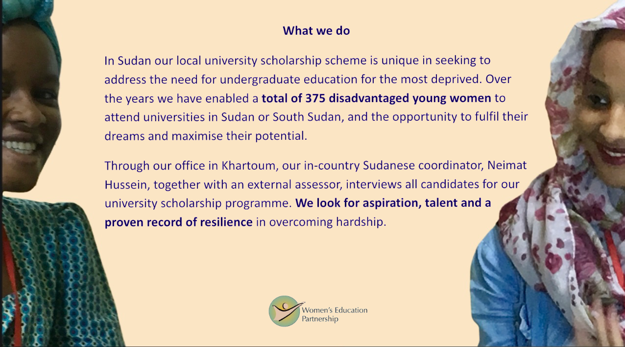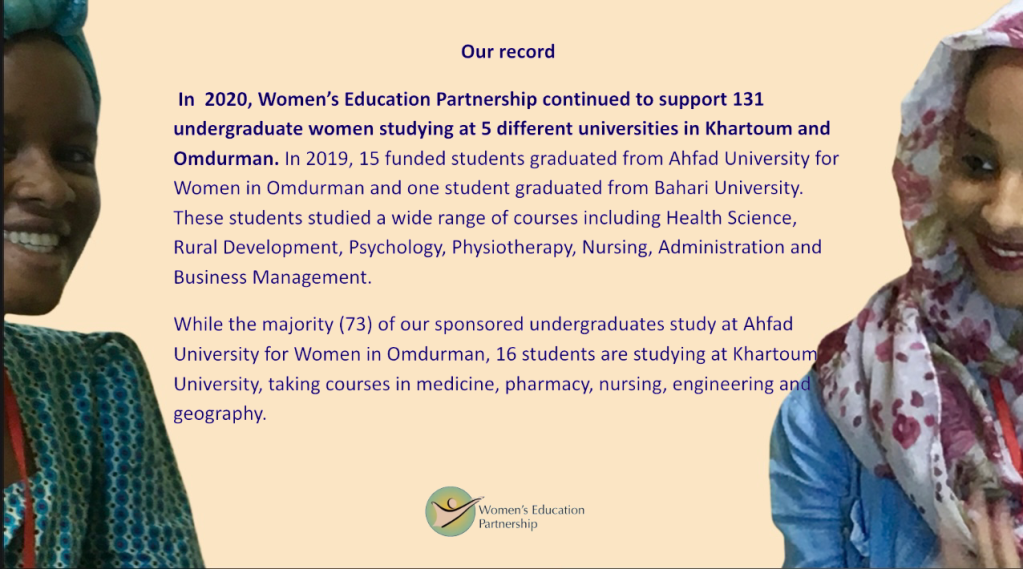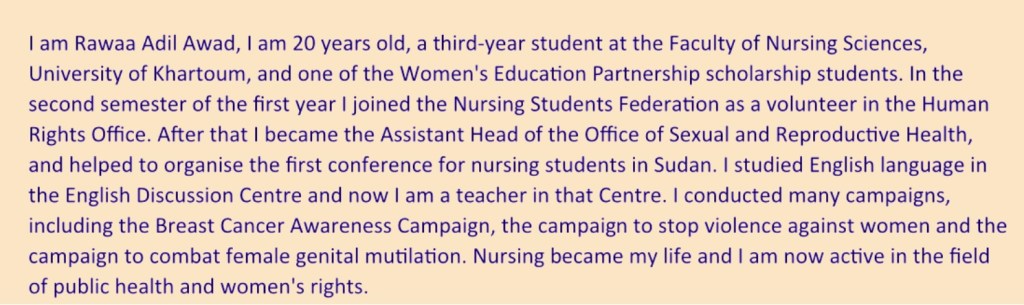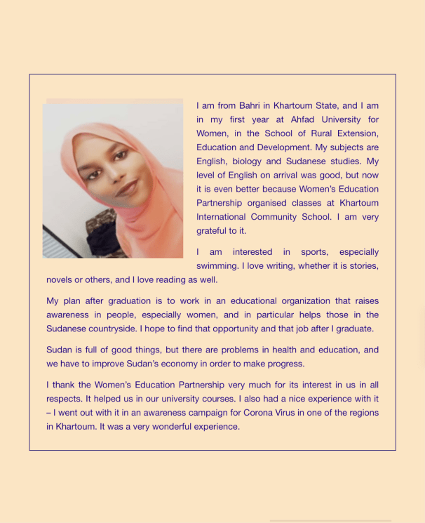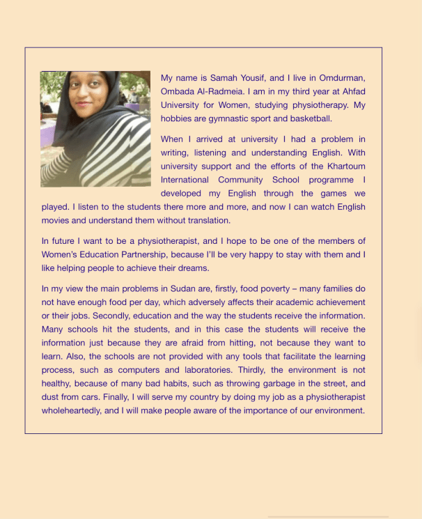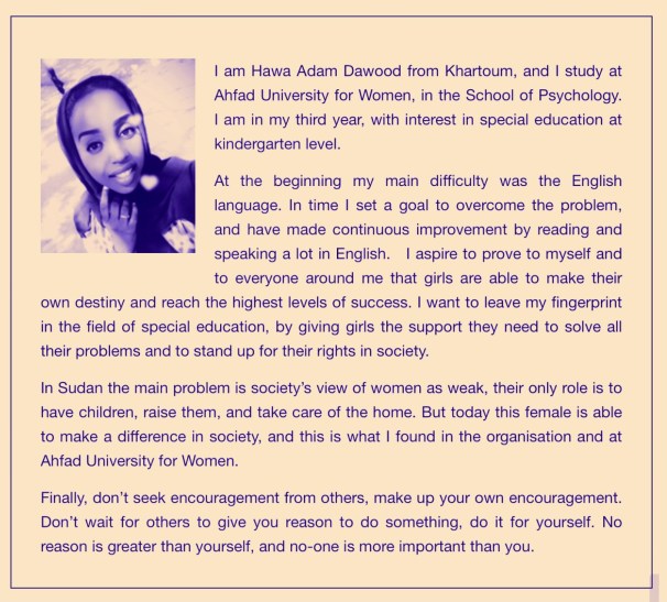 “In Sudan the main problem is society’s view of women as weak…but this female is able to make a difference in society, and this is what I found in the organization and at Ahfad University for Women.” Hawa, WEP university scholar.