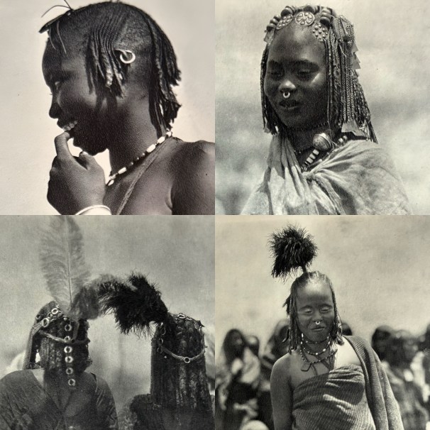 The photographs in this post come from books or prints in my possession or are in the public domain. Wherever possible I have credited their source. Recognizing sensibilities and issues of consent surrounding the circumstances in which colonial photos may have been secured, some images have been cropped or blurred. Above, a young woman of Omdurman with her elegant mushat. (Der Dunkle Erdteil, Berlin 1930).