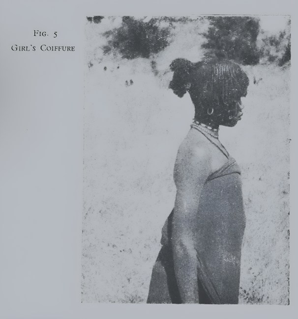 “Most unmarried women in riverain Sudan went about with their heads uncovered. Slave women were supposed to go with their heads uncovered in the presence of their masters. The hair was worn in a plaited style called rasha, spreading, and the general shape and appearance of this style is similar to many pictures of slave and dancing girls in ancient Egyptian times.”