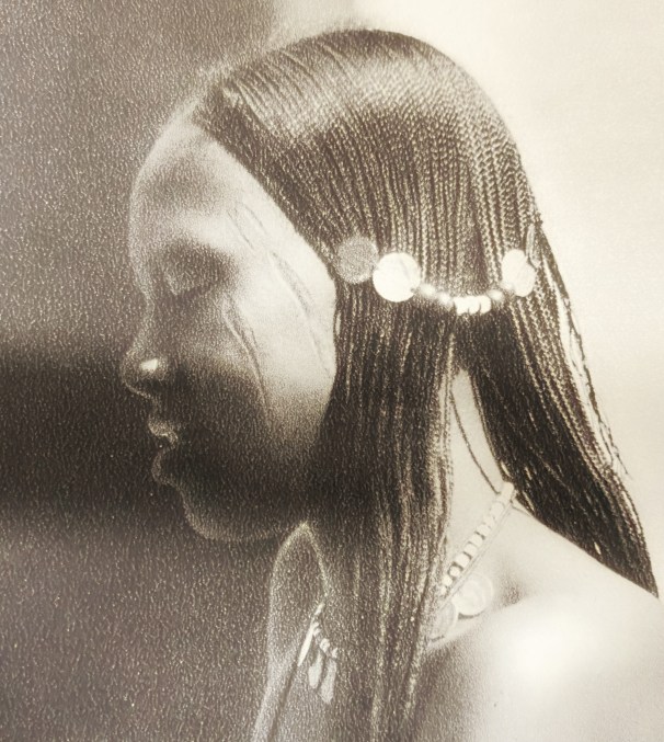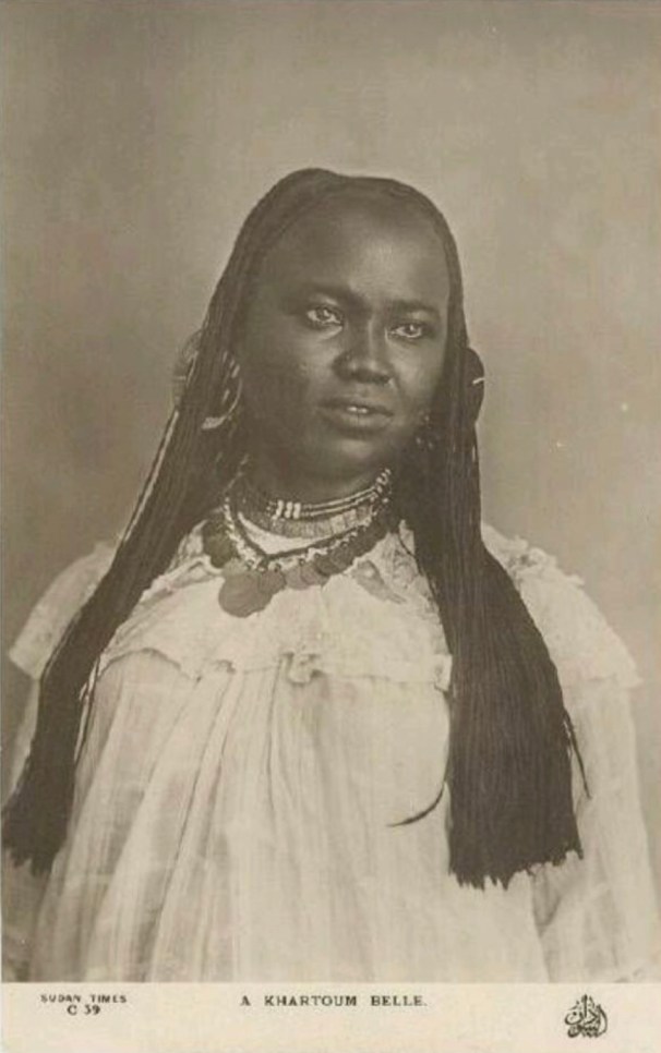 Above, portrait of a Sudanese woman (photographer unknown, 1890-1923, Wikipedia, CC). The young woman’s hair is dressed in the fine mushat plaits or braids interwoven with beads and jewels which for so many generations have embodied northern Sudanese canons of beauty.