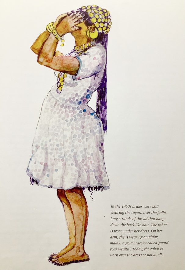 Below, Griselda El Tayib’s illustration of a 1960s bride, still wearing the jadla threads referred to above. Regional Folk Costumes of the Sudan, p 139).