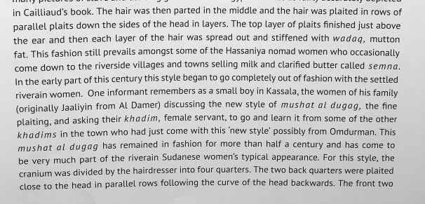 “Most unmarried women in riverain Sudan went about with their heads uncovered. Slave women were supposed to go with their heads uncovered in the presence of their masters. The hair was worn in a plaited style called rasha, spreading, and the general shape and appearance of this style is similar to many pictures of slave and dancing girls in ancient Egyptian times.”