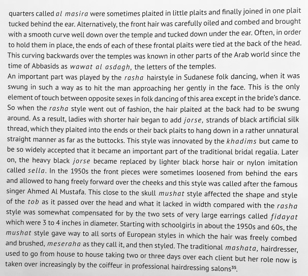 She also notes that the fashion for “jorse”, strands of black artificial silk thread, plaited into the ends of women’s back plaits, so much part of traditional northern Sudanese wedding rituals, was innovated by servants.