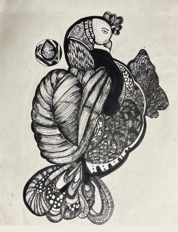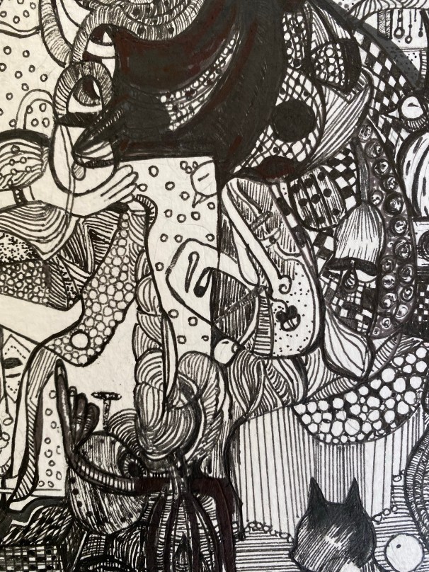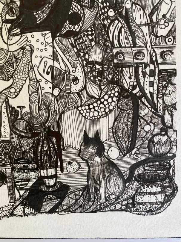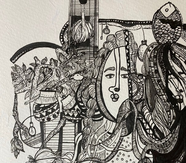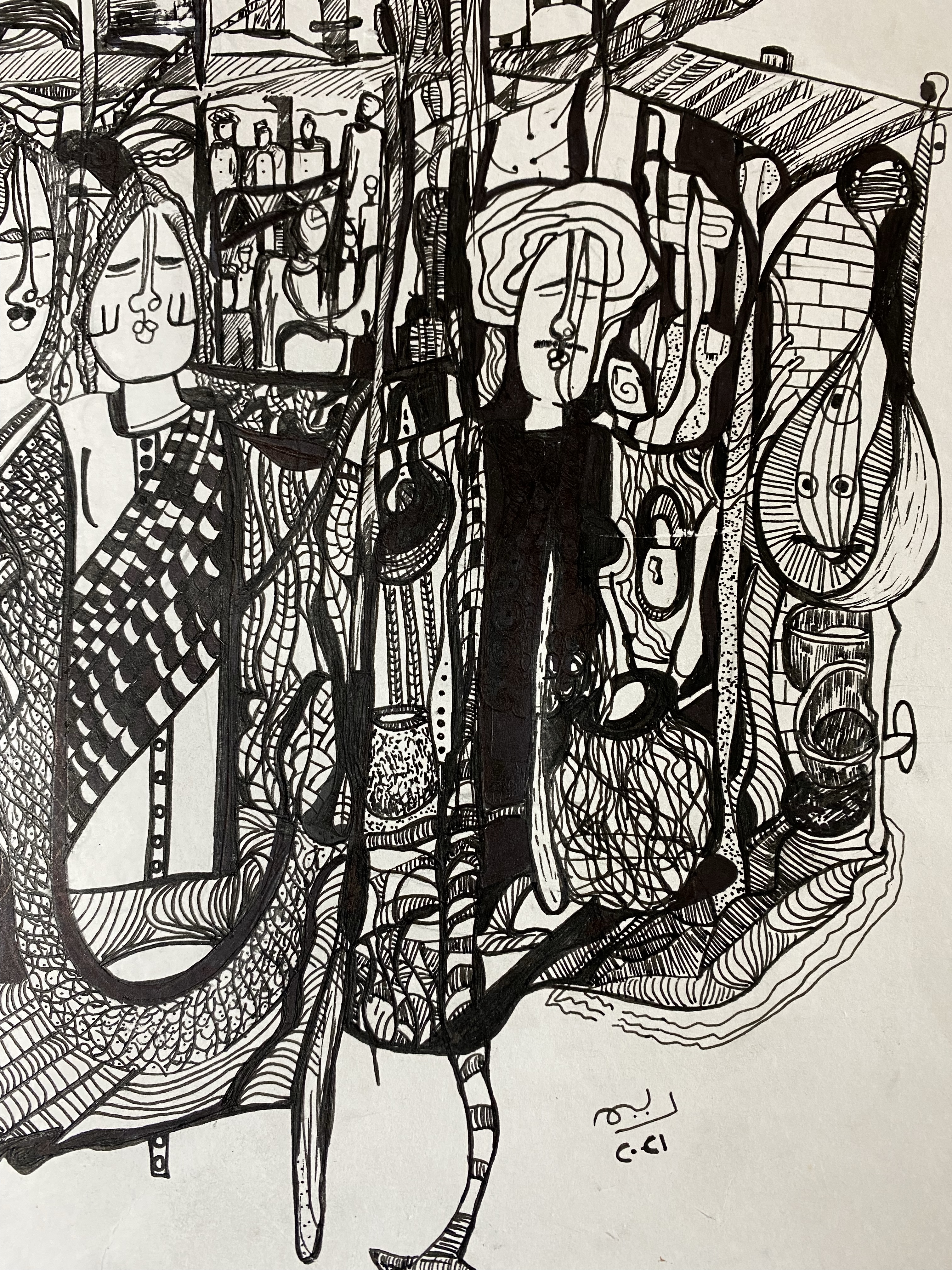 Reem explains: “A date with My Memory expresses what’s on my mind; usually my thoughts are messed up before I start drawing and whats happens is I gather all these thoughts into the drawing. I like what I think of as “irregular” drawing, so I like to include so many different things such as birds, pots, animals, faces, flowers and fantasy characters.”