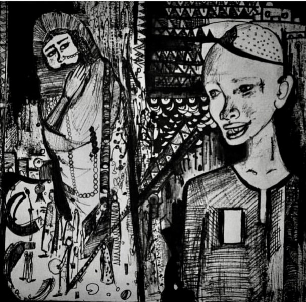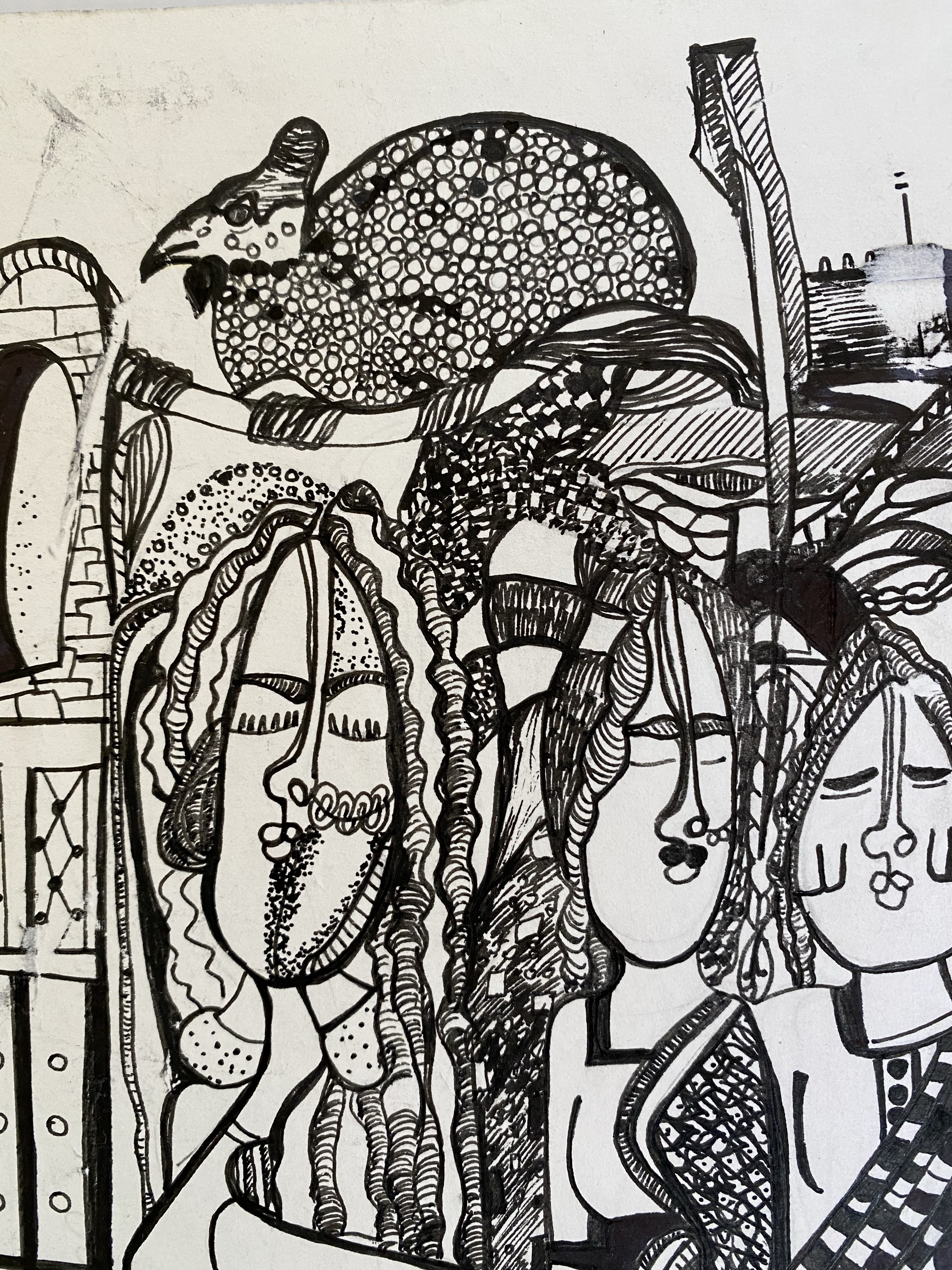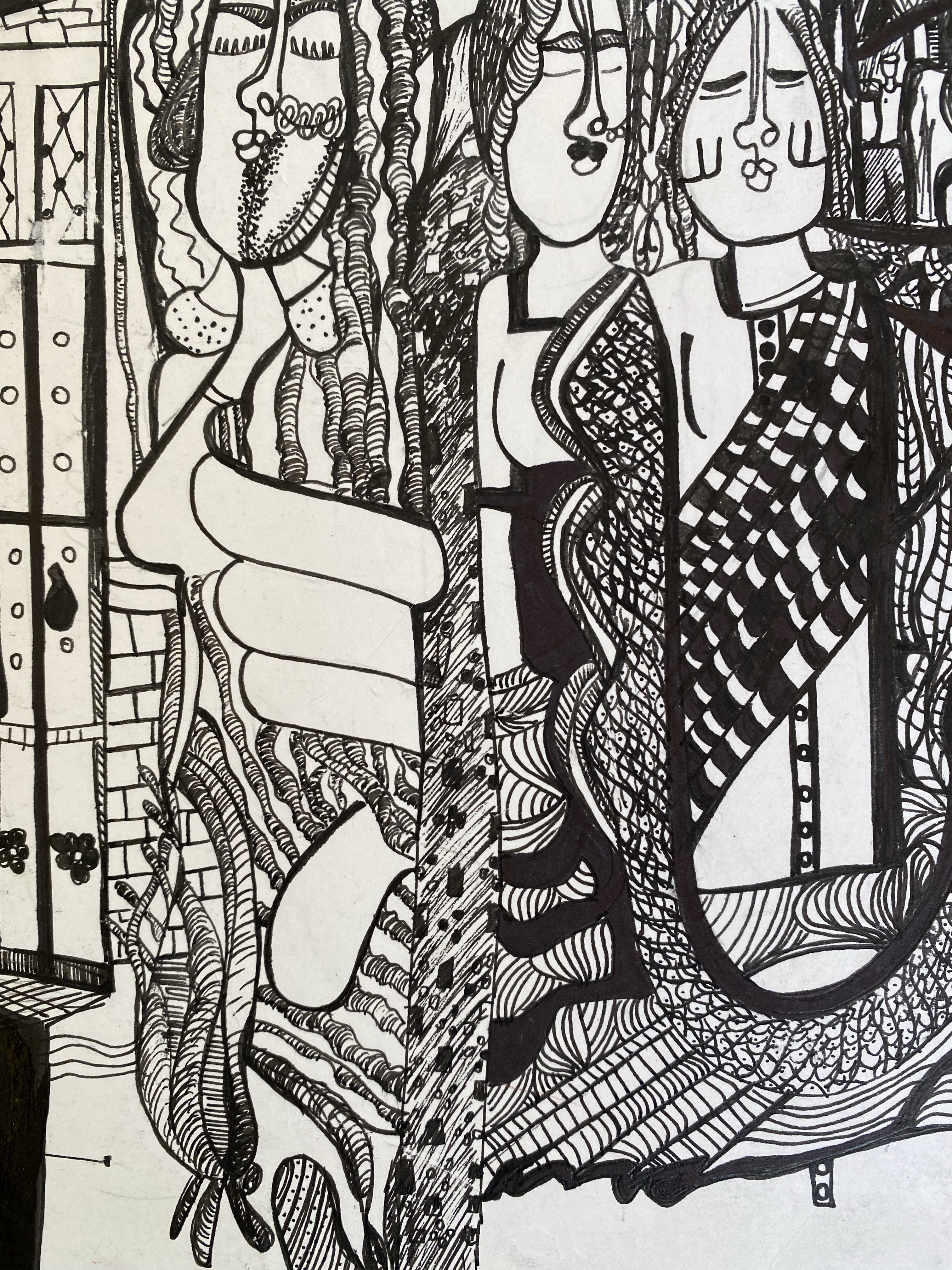 This week ‘s post is dedicated to the talented young US-based Sudanese artist, Reem Alsadig, who was kind enough to tell me a little about herself and her art. Below, fascinating details from her pen and ink work, “A Date with My Memory”. Totems of Sudanese domestic life – earthenware pots, onions, and birds tenderly woven into a dream-like fabric of white-walled adobe houses and masked faces.