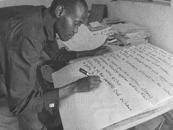 Below, preparing a lesson, St Kizito’s Primary School, Isohe, Letters from Isohe, p75.