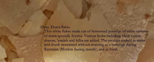 Above, flakes of hilu-murr drying in the late afternoon sun. When soaked, the flakes make a refreshing Ramadan iftar (fast-breaking) drink. It is complex and fragrant with spices such as “ginger, ghurungal, cinnamon, coriander, cumin, black cumin, black pepper, cloves, hilba, habba-han, and decoction of karkade (hibiscus)”. The sorghum and spice mixture is fermented, often with date gruel, and baked into flakes which are soaked in water for two hours, strained and sweetened before serving. (Sudanese Traditional Medicine, Ahmad Al-Safi.)