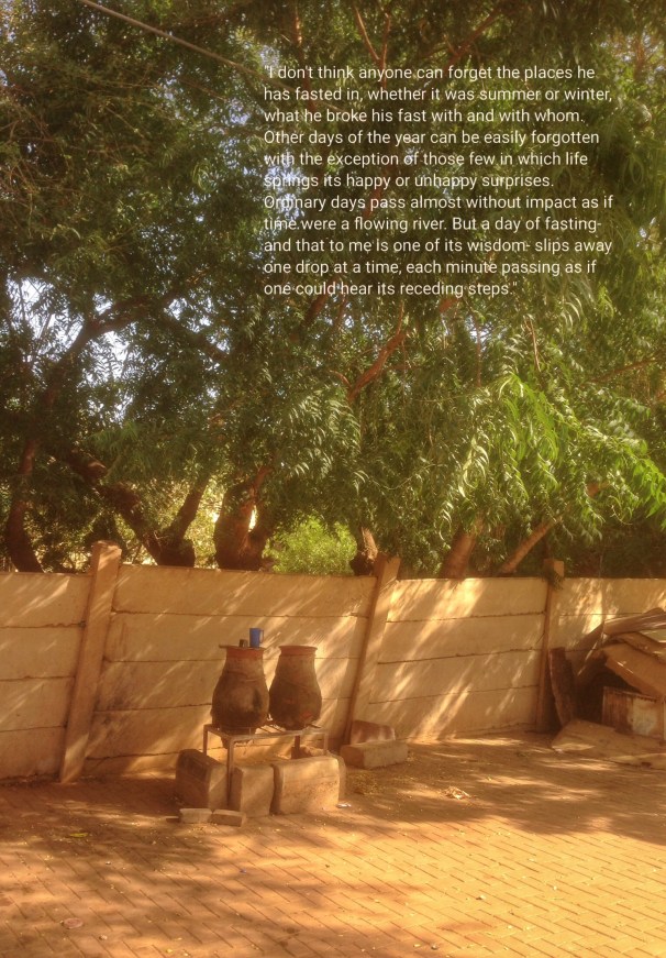 As the long fasting day unfolds, for the faithful, the leaden weight of physical weariness distills minute by minute into glimpses of the timeless and the eternal. The ceaseless flow of life’s river as Tayib Salih recalls, mysteriously stayed: