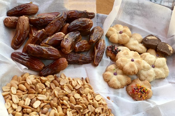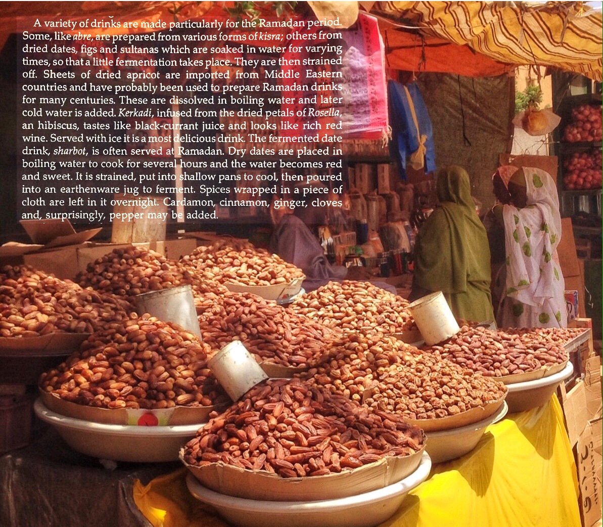 “This was part of the charm of Ramadan, turning day into night, treats of mixed nuts, dried apricots and dates. Badr did not begrudge his family any delicacies. Every day he went to the souq and every day Haniyyah cooked delicious meals and satisfying puddings. It was a month of plenty, and he marvelled at how rigourous it was, and at the same time buoyant; solemn, and at the same time merry, with the children playing football in the street by the light of Ramadan lanterns.” Left, Ramadan dates, biscuits and nuts.