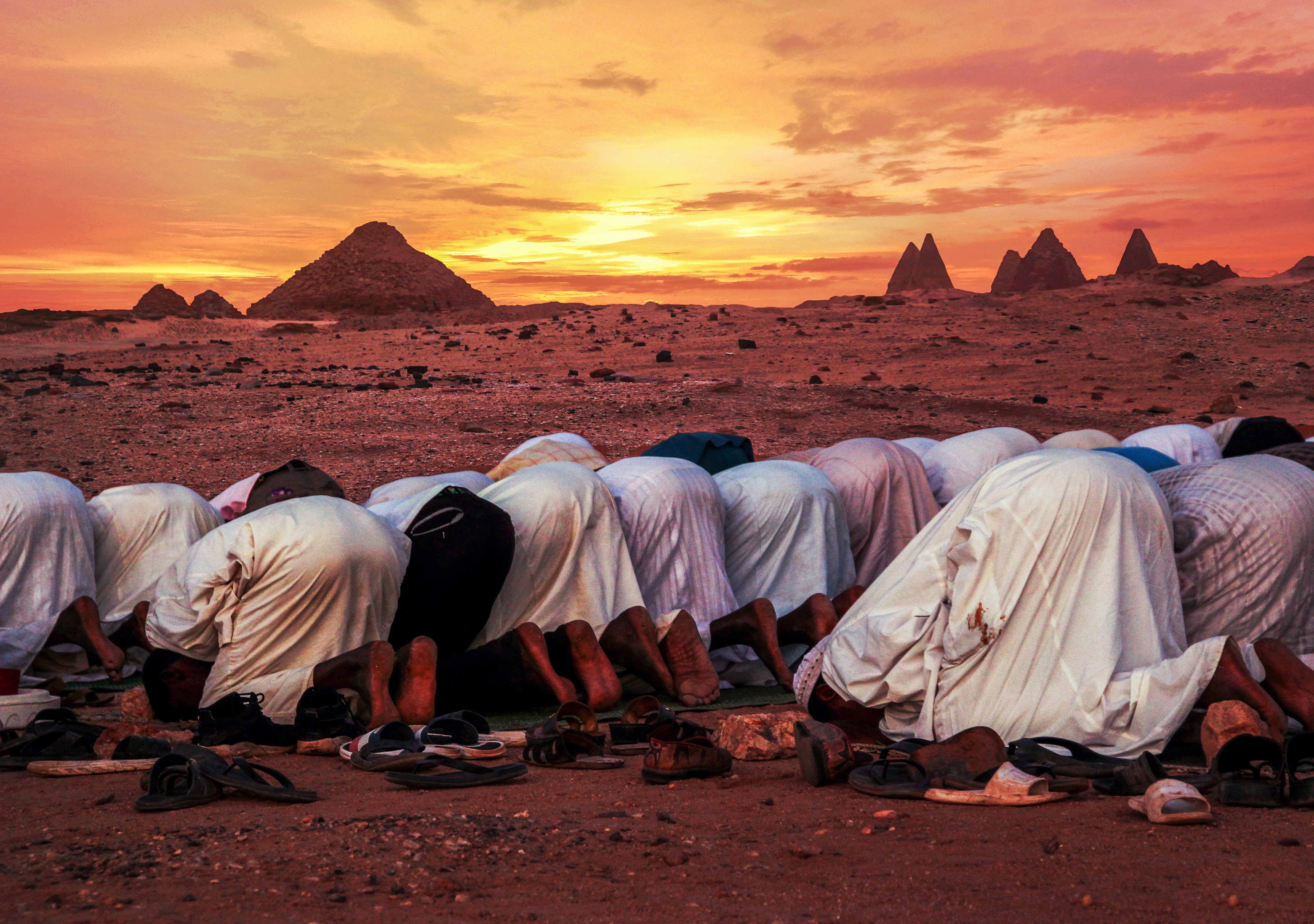 Other photos, my own or from Dreamsline.co, under contract; sunset prayers to the backdrop of the Meroe pyramids, sunrise over Khartoum and prayer caps for sale in Souq al-Arabi.