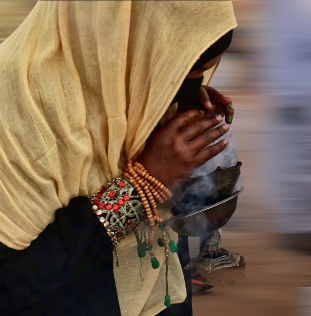 “In the folds of my memory something stirs: a childhood hero of mine, a female Sufi mystic of high birth who shunned the mundane and lived by the side of a river, in mystic devotion. Lines etched in my memory are released to me from her Sufi mystic poetry. And I enjoy their effect on me: I hold two loves for thee/ Devotional, and a love worthy of thee / The first is, as I think of none but thee/ The second is an anticipation of seeing thee / Neither did I find without your grace to me! The texture, contours and complexity of this mystic poem are mind bending and delicious. Mercy as the experience of family, the feeling a loss that humanizes, and the grace of love. And that is just the beginning.” Right, a worshipper at the Hamed El-Nil Friday dhikr swathing herself in purifying incense.