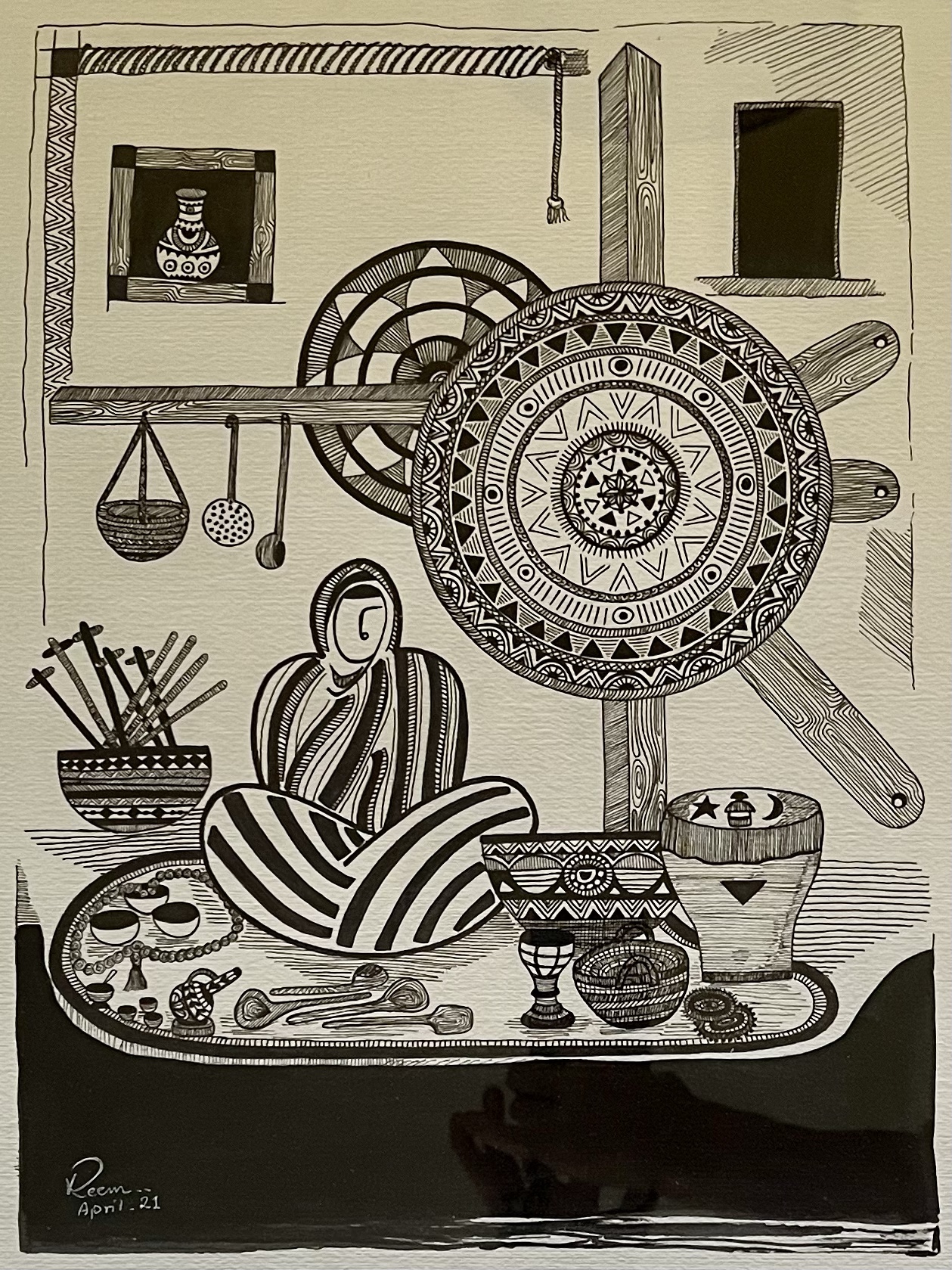 This week I reproduce Reem’s 2021 delicate homage to so many of the handicrafts and utensils emblematic of northern Sudanese domestic life. Below, Reem celebrates the double suns of finely woven palm fibre food covers or tabaga, vibrant with Darfuri motifs, the mesh of wooden swivel sticks or mufraka for blending stews and sauces, the richly patterned food baskets or guffa, the wooden hugg for perfumed marriage pastes, the oval-based jebana or coffee pot on its beaded stand or wagaya; the prayer beads and incense burner.