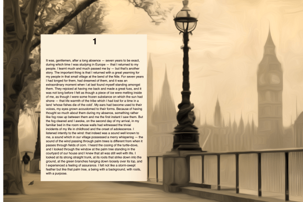 Title montage, scenes of Victoria Station, 1930s and Lady Justice of The Old Bailey. Below, London in the the fog as a backdrop to the first page of what is held by many to be the greatest Arabic novel of the twentieth century.