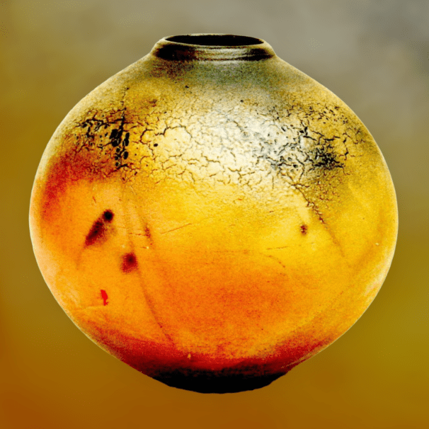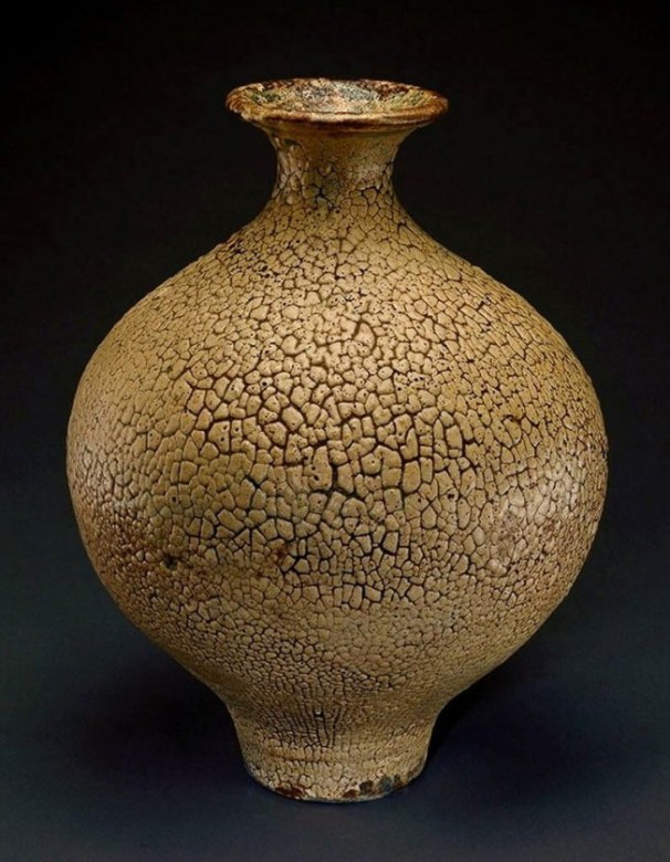 Abbaro “formed the hollowed sphere of this pot with its tapered ends by building up coils of clay and then smoothing the walls, which he coated with a series of glazes. After they dried, the pot was fired in an electric kiln. To produce its reptilian surface, the pot was dipped in a magnesium slip and fired again.” Visionary Artists – The Khartoum School