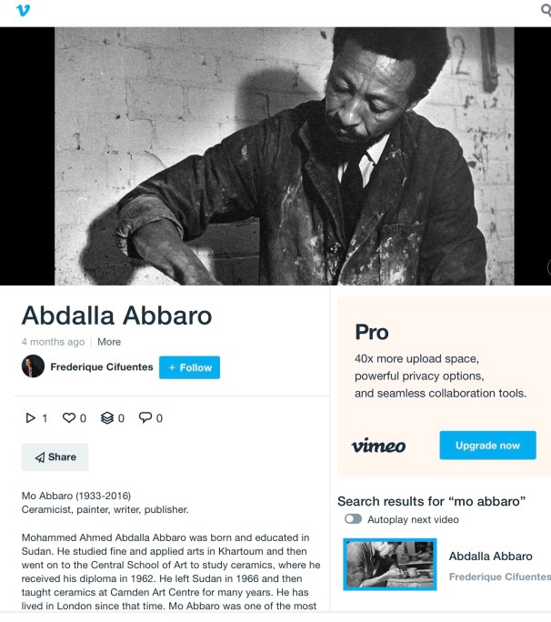 This week’s post explores the work of the late, great London-based Sudanese ceramicist, known to so many as Mo Abbaro. For this artistic polymath who reprised his early loves of textiles, painting and even knitting and carpentry in later life, ceramics was nothing less than the celebration of “how earth works.” And it was the thrill of learning “how earth works” – the science, chemistry, endless industrial applications, as well as the delicate artistic and painstakingly honed artisan skills it encompasses – that led him to “pioneer glazing and firing techniques” and excel in “bold experiments in new slips and surface treatments” to create wonderfully complex tactile, organic forms. Photo above left, still from Moniem Ibrahim’s intimate Arabic film tribute Mo Abbaro – Moniem Ibrahim