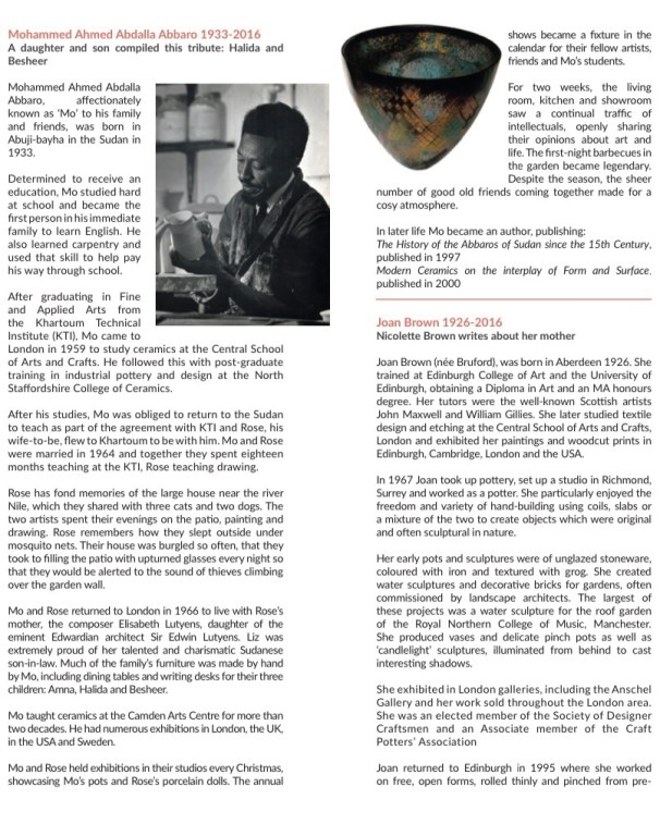 “For two weeks, our family home saw a continual traffic of intellectuals and celebrities — Marty Feldman was once a guest — openly sharing their opinions about art and life. The barbecues my parents held in the garden just before Christmas, often in the snow, with Sudanese food cooked by Mo, became legendary and are fondly remembered by his family and friends. I myself have happy memories of the potter’s wheel whirring late into the night as Mo prepared for one of his exhibitions. Even in the coldest winters, the house was kept warm by his kiln firing a steady stream of beautiful pots. His signature effects included bubbling textured surfaces and animal forms. I’d often drop into his studio to find a new set of perfect goblets fresh from being biscuit-fired in the kiln, their distinct smell of warm, dried clay permeating every room.”