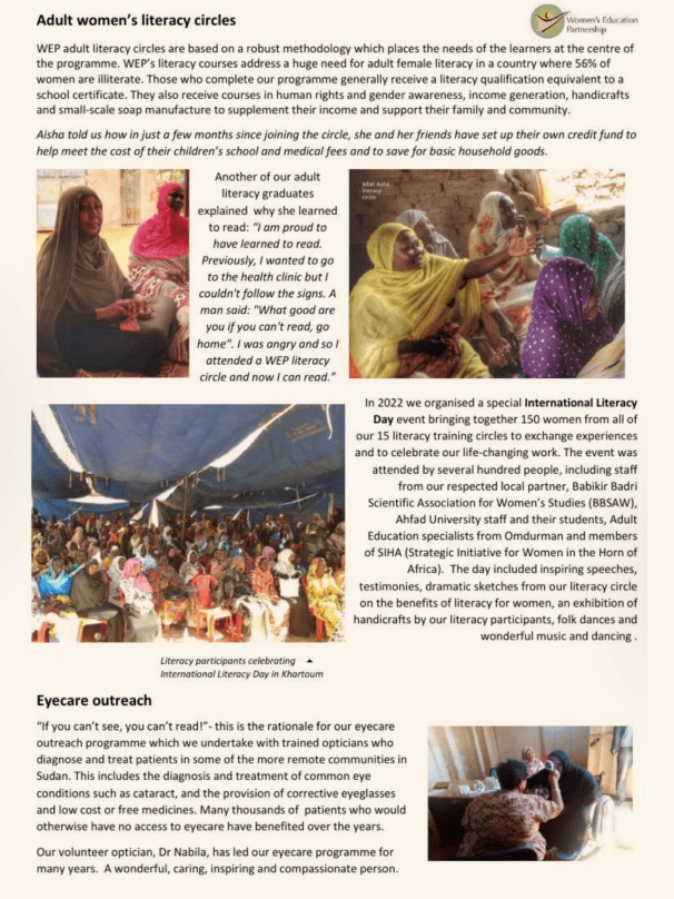 This year has sadly proved to be yet another very challenging one. We are so grateful, given the problems faced by so many in 2022, that you have continued to support our work. This has meant that we were able to sponsor more bright young women to study at university, carry on delivering women’s literacy in some of the poorest communities in Khartoum and contribute to the repairs of flood-damages schools.