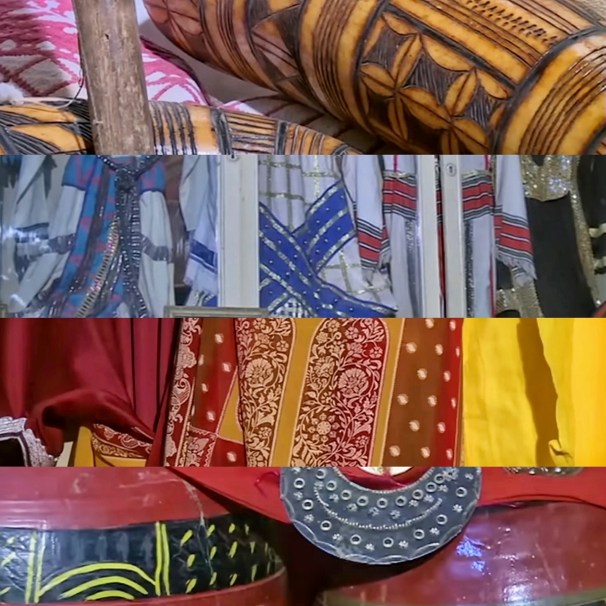 Among the many fascinating insights Saadia Al-Salahi brought us over her long research career – she only retired at the age of 75, were those related to the symbolism of colour. She talks entertainingly of the symbolic role and resonances of red in Sudanese dress and folklore in رنامج «العديل و الزين» “قناة النيل الأزرق” “عيد الأضحى. Her research also led her to the conclusion that black was worn in the Darfur Sultanate to welcome guests, while red was associated with death and orange with adventure and hunting (El-Obeid) and that in Sennar, the use of colour was central to the expression of social status. (Photos above, items from her collection).