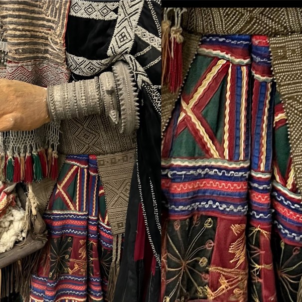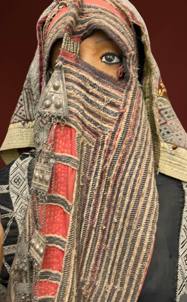 Above, detail of Rashaida dress (waist down), worn outside the tent and further afield (Sudan Ethnographic Museum, Imogen Thurbon). On the right, we can see the highly ornamental, bead-encrusted belt, known as the Sirdaag, which William Young explains, is tied securely to waist with the upper part of the belt hidden by loose folds of the wearer’s clothes so as not to accentuate her figure. The two large rectangular panels in front, he notes, “hang well below the waist and are designed to be seen”. On the left, we see how finely worked and close-fitting large silver cuff bracelets offset the flowing looseness of the heavy skirts and complement the bands of geometric beading that embellish the wearer’s veil.