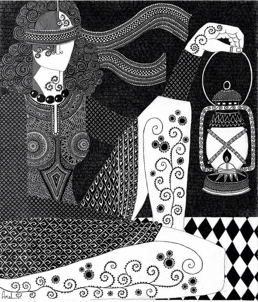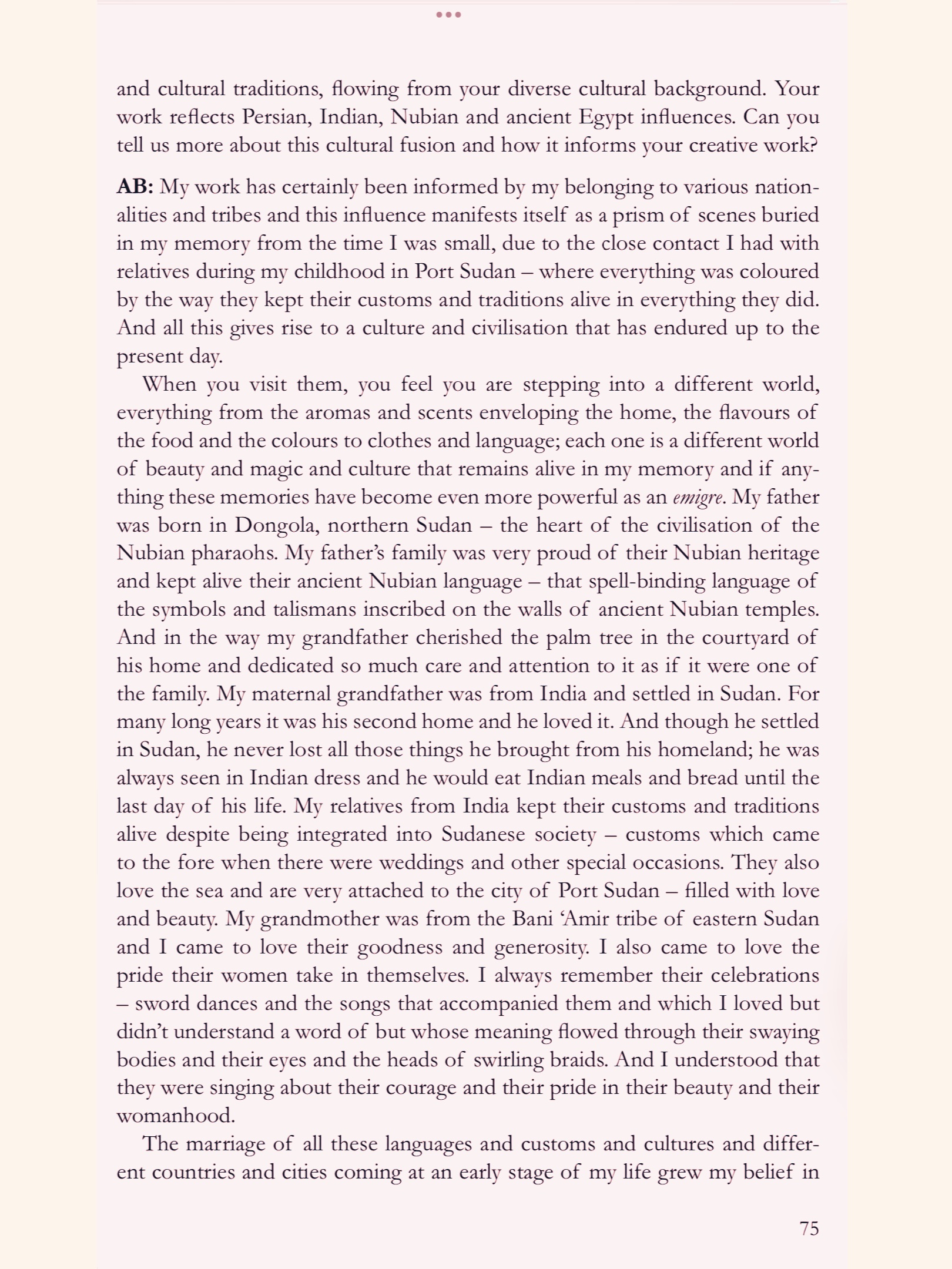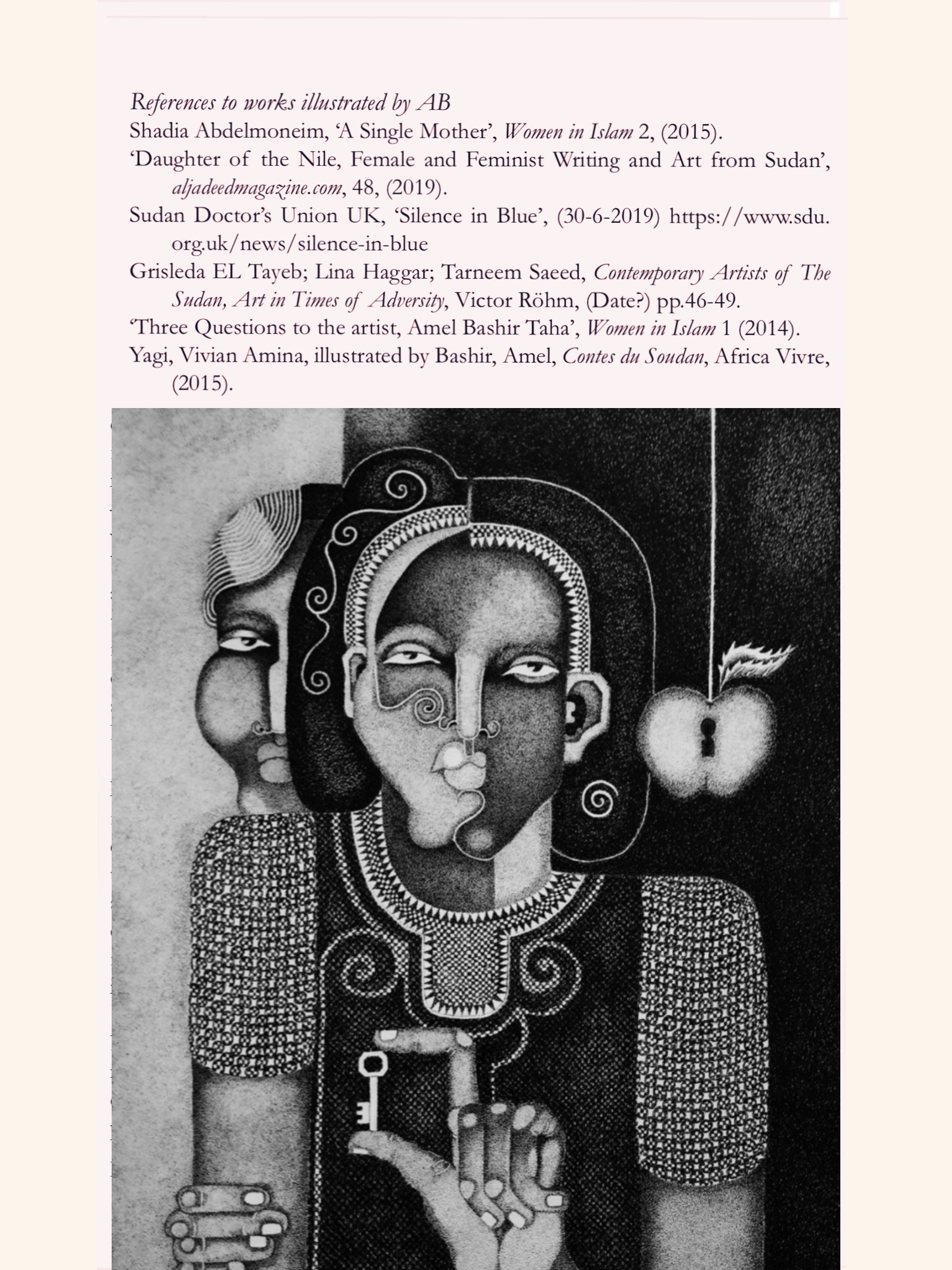 This week, with kind permission of The Society for the Study of the Sudans, I reproduce an interview with the remarkable Sudanese artist, Amel Bashir, first published in the Journal of SSSUK in July 2021. Amel reveals the sources of her artistic inspiration and the role her family and her childhood have played in shaping her complex, delicate style in a warm, lively conversation. She explains too how the power and grace of Sudanese women inform her art.