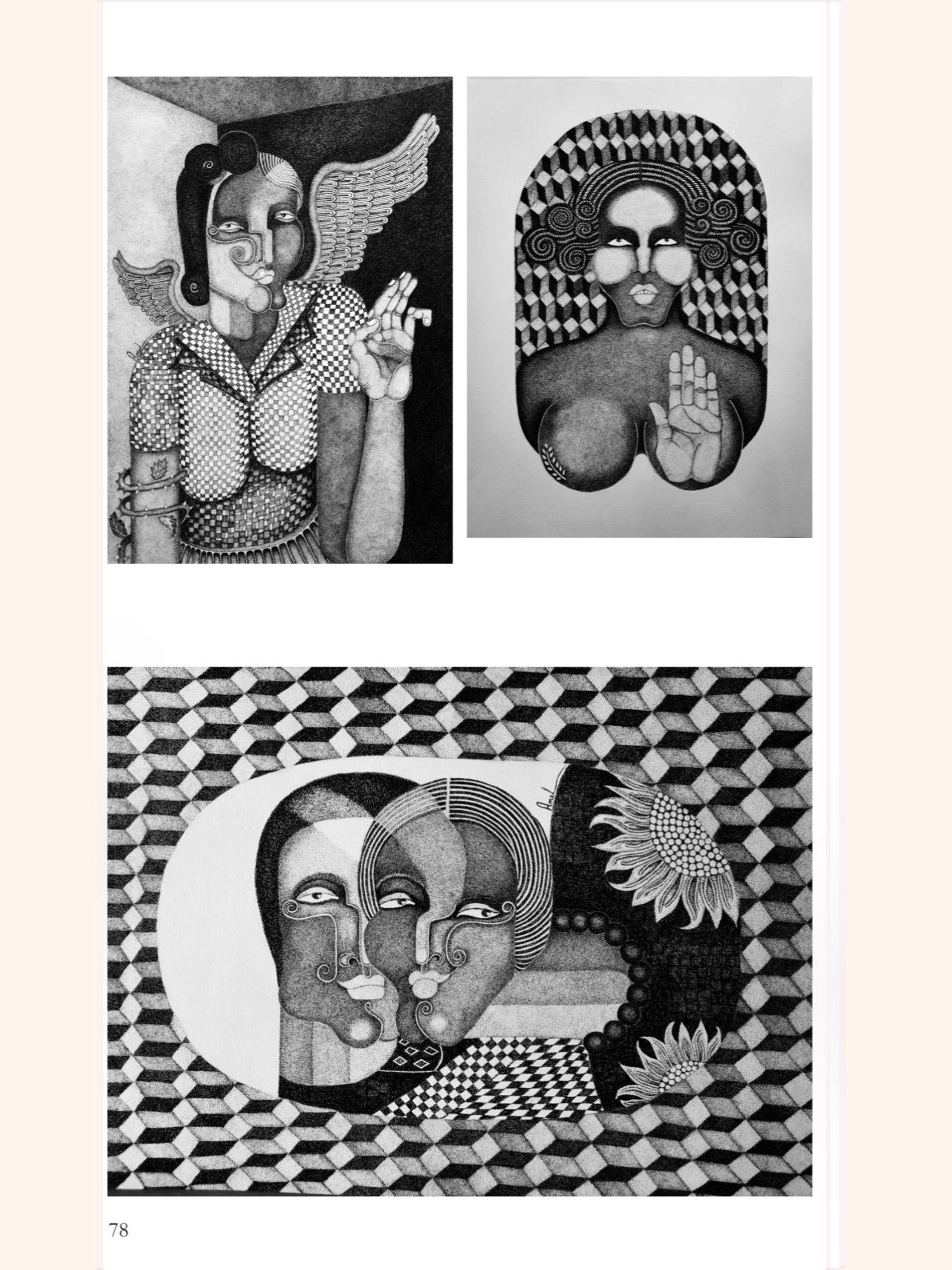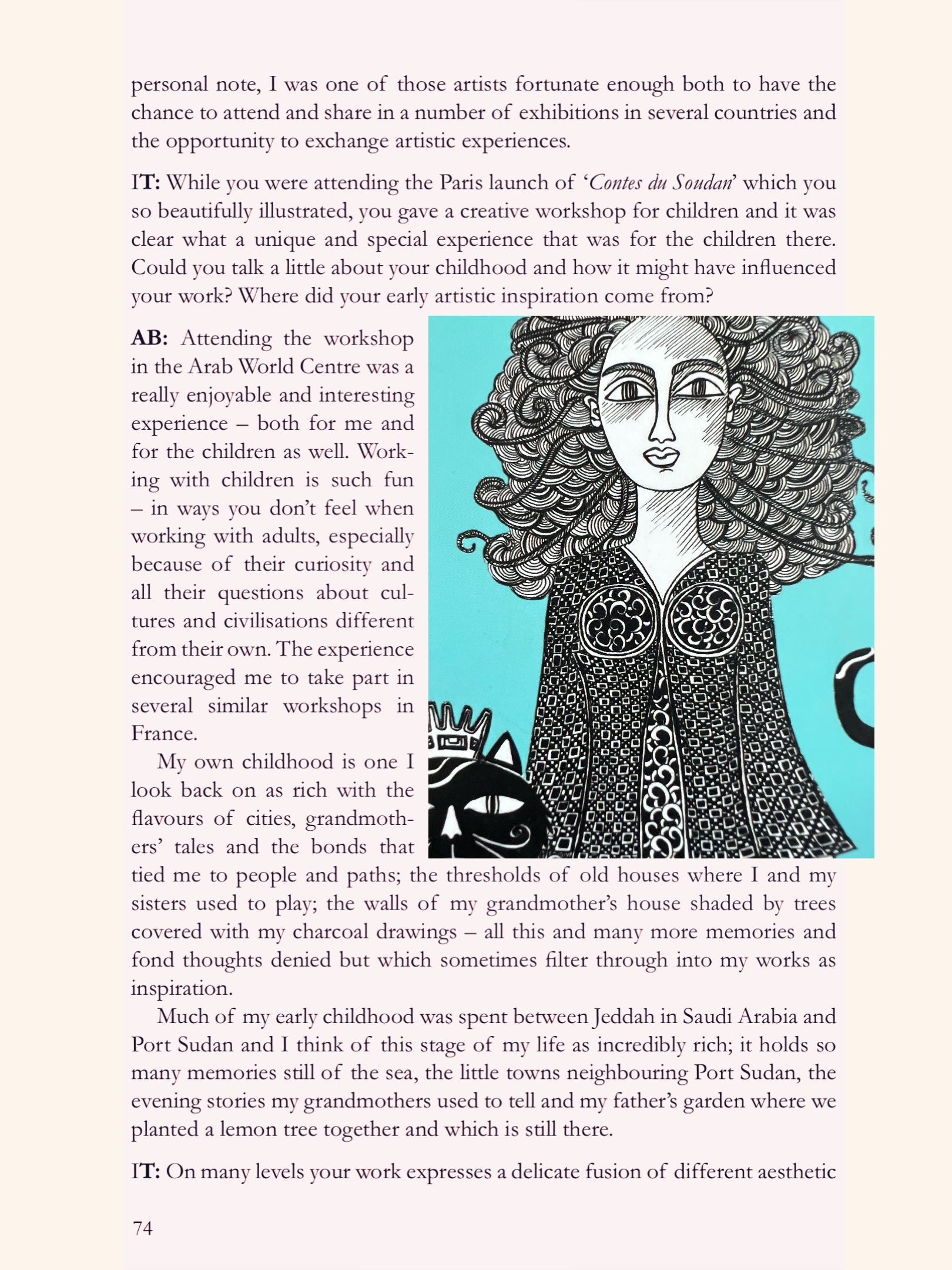 Above, Amel holding a copy of Contes du Soudan, a collection of traditional Sudanese folk tales told by grandmothers to their families, magically illustrated by the artist. The collection was published in 2015 by Éditions du Jasmin. Below, just some of her artwork in the collection.