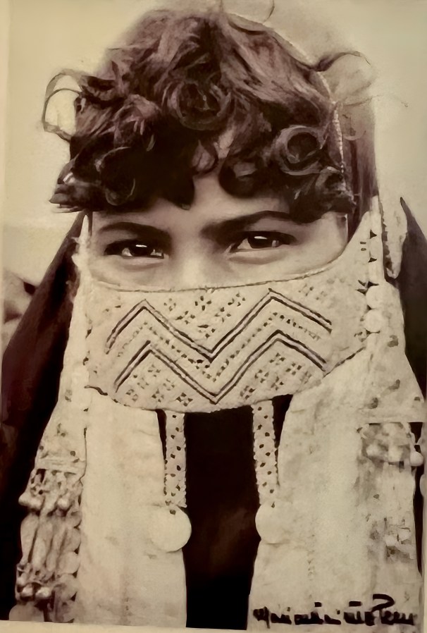 “The young girl’s face veil, called a mungab, was made of black material decorated with lead and sliver beads called rusas. It was worn just above the tip of the nose and usually fastened behind the back of the head usually with a leather thong in a way that cannot be seen under the head veil. Such veils would be decorated sometimes with leather tassels hung down at each side of the veil to disguise the ears. This face veil gave the appearance of being fairly rigid and was outlined in pearly buttons and bands of tilul. The centre of the face mask was weighed down by a vertical row of coins – some real and some imitation and known as dumu´a or tears.”