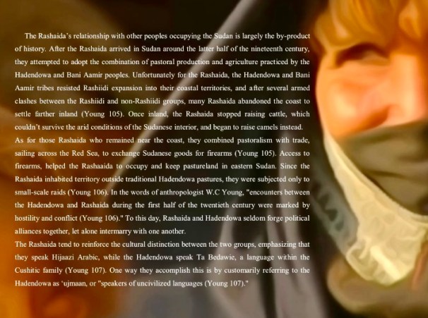 Above, Purdue’s historical overview of relations between Rashaida and non Rashaida peoples in Sudan and their abandoning of cattle for camel husbandry in the Sudanese interior. The Rashaida are known in Sudan for their cultural distinctiveness, reflected in their language, dress and pastoral customs. They rarely marry outside the tribe.
