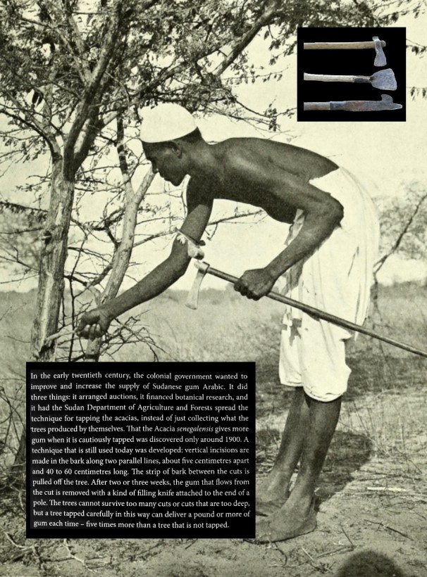 Text inset, tapping techniques, as described by Dorrit van Dalen, as above, p 136. Inset, top right, traditional tapping tools: top, the small axe or farrar, middle, the makmak, used for tapping the aciacia seyal or talH, and bottom, the sonki (Effect of tapping tools and date of tapping on Acacia polyacantha gum yield in South Kordofan State, Sudan, Idris Musa and Kamal Fadl). Recent research has focused on redesigning of the sonki to reduce damage to the tree, see for example ETFRN Restoring the gum arabic belt in Sudan with local communities