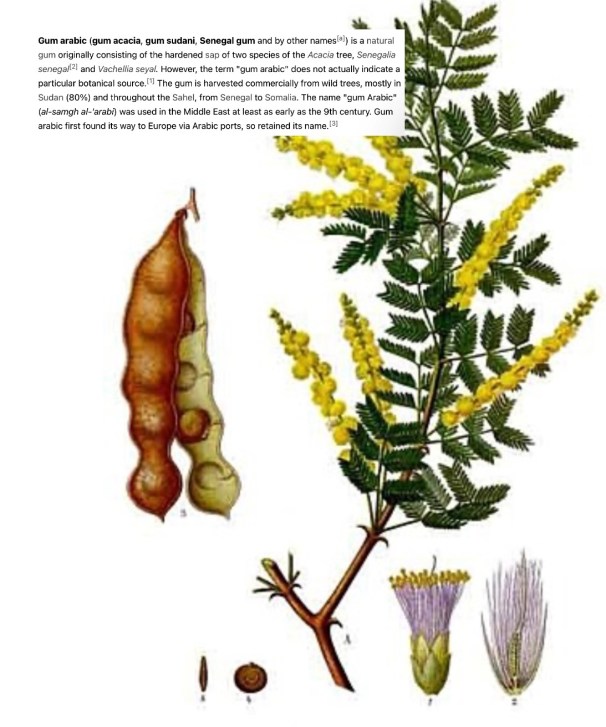 The gum bearing acacia variety outlined below (Wikipedia), acacia senegal, is known in Sudanese Arabic as hashab or sunt. Sudan is the largest exporter of top grade hashab gum arabic. Gum, often indistinguishable from that of the acacia senegal but considered of slightly inferior quality, is also harvested from the talH tree, acacia seyal, whose aromatic wood is used in incense and smoke baths.