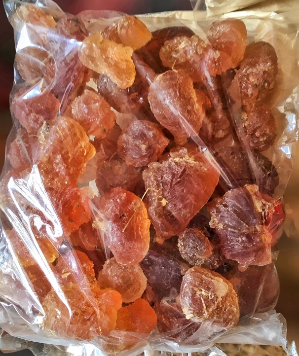 He was stunned, describing what he saw as:”beautiful, amber-coloured masses upon stems and branches”. The size of nutmeg to oranges, the crystalline circles of gum were ” as hard as ice on the exterior, limpid in the centre, resembling melted amber”. These “beautiful balls of frosted yellow gum recalled the idea of precious jewels upon the trees in the garden of the wonderful lamp of the Arabian Nights”. He also recorded that the fresh gum he ate while hunting rhino was “exceedingly sweet and pleasant to the taste”.