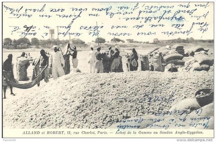 Above, gum arabic merchant traders in El-Obeid, colonial postcard. El Obeid is the largest of four central markets for gum arabic in Sudan, ahead of En-Nahud, Um Ruada, Rahad). In the early 20th century “two hundred kilos of gum were unloaded every month from November to March in El Obeid from each of a few thousand camels. Now some three hundred truckloads of twenty tons are deposited every month.” (van Dalen)