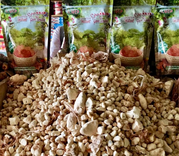 Pouches of gum arabic propped behind nuggets of tabaldi fruit at a Souq Al-Arabi grocery stall in 2019.