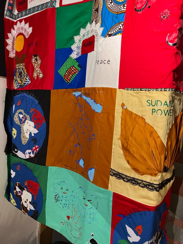 Liela: The toub has been displayed at Sudanese community meetings, for example, last Sunday, 17 September in Birmingham, and at the SSSUK event, where we met. It’s featured in Waging Peace’s newsletter and at an event organized by Waging Peace and Holocaust Memorial Day Trust with members of the UK Sudanese community, attended by HRH King Charles. We hope to continue to share the power of the giant toub representing the strength and fortitude of Sudanese women with parliamentarians – as a symbol that helps keep all eyes on Sudan and towards peace. We have high hopes for the giant toub to keep evolving and growing – and travelling! – to inspire hearts and minds.