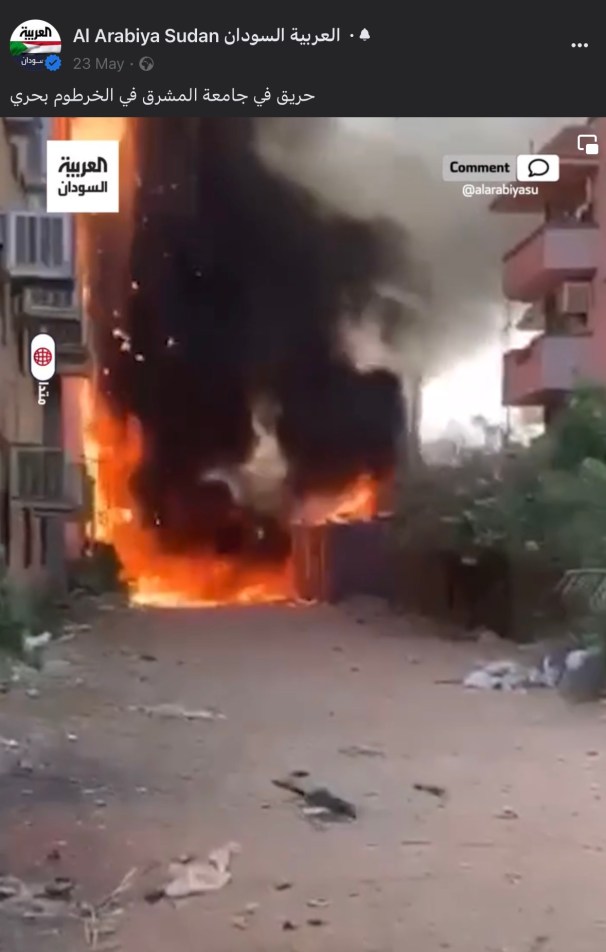 Left; the burnt-out shell of Khartoum Airport, Al-Arabiya News, below, Al-Arabiya and Dabanga News photographs showing destruction in Khartoum and Darfur.